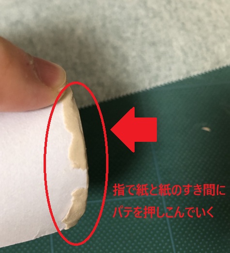 紙の表面はつるつるしているので、最初はくっつきにくいですが、指先に力を込めて隙間にパテを押し込む感じでくっつけていきます。