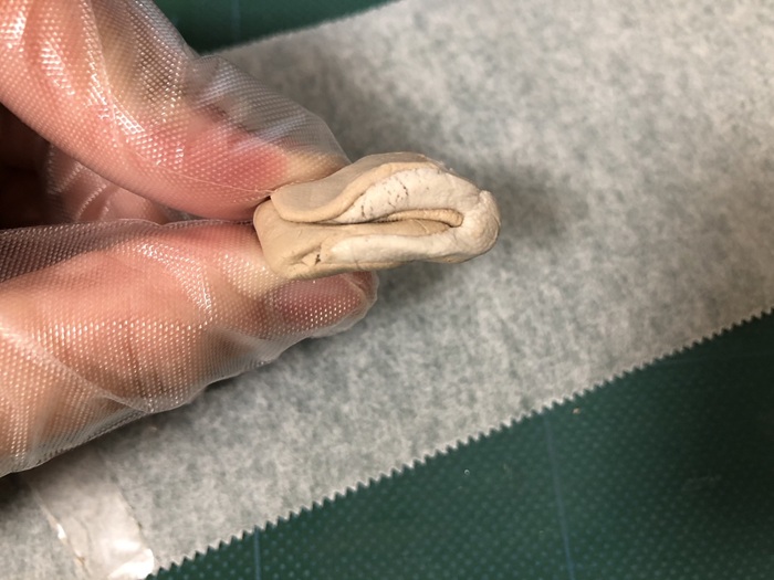 輪切りにしたパテをつぶして伸ばし、折りたたんでまた伸ばすことで混ざっていきます。