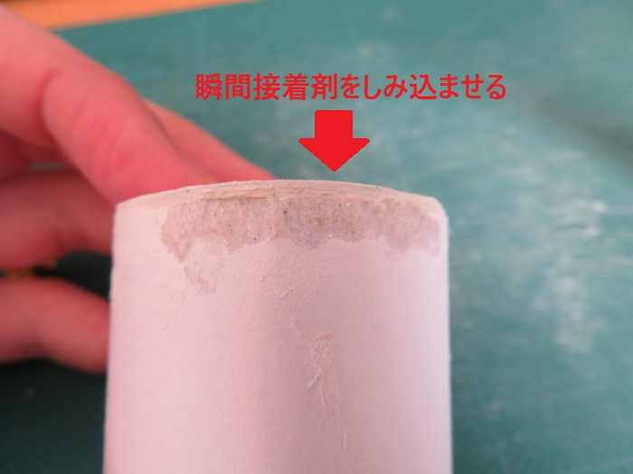 けば立った紙の表面には瞬間接着剤をしみ込ませて、乾燥させたら表面を鳴らすためにやすりがけを行います。